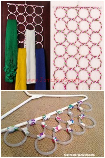 قومي بشراء حلقات بلاستيكية وشعيها في شماعة وعلقي عليها الإيشاربات والطرح .. ويمكن ابراز الطرح بشكل اكبر يمكنكي تجميع الحلقات بشكل متتابع وتثبيتها جنبا إلى جنب