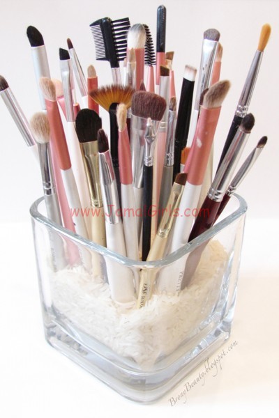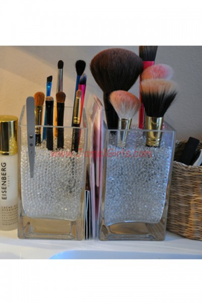 كي تحفظي مكياجاتك المتناثرة قومي بإحصار فازة زجاجية او مرطبان واملئيه واملئيه بحبات الأرز أو الرمل أو الكرات