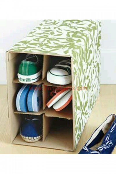 واذا لا يوجد لديكي مشكلة يمكن ان تخزين الاحذية بالغرفة بشكل بارز .. وذالك بالاستعانة بالصناديق الكارتونية الملونة الكبيرة وتقسيمها من الداخل لعدد من الفتحات المربعة كي تضعي