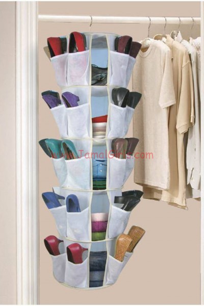 الى شماعات صغرة لحمل الاحذية وتعليقها على حبل سميك مثبت داخل الخزانة